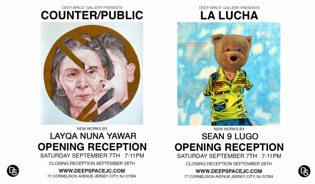 Deep Space Gallery is very pleased to present our new exhibition featuring solo shows by two artists whose inimitable styles are recognizable in public spaces from Jersey City, Newark, NYC and Philadelphia to El Salvador and the Dominican Republic. La Lucha features new works by Sean 9 Lugo and Counter/Public features new works by Layqa Nuna Yawar. The artist duo are coming back together in Jersey City for the first time since their two-man show at the legendary 58 Gallery nearly a decade ago.